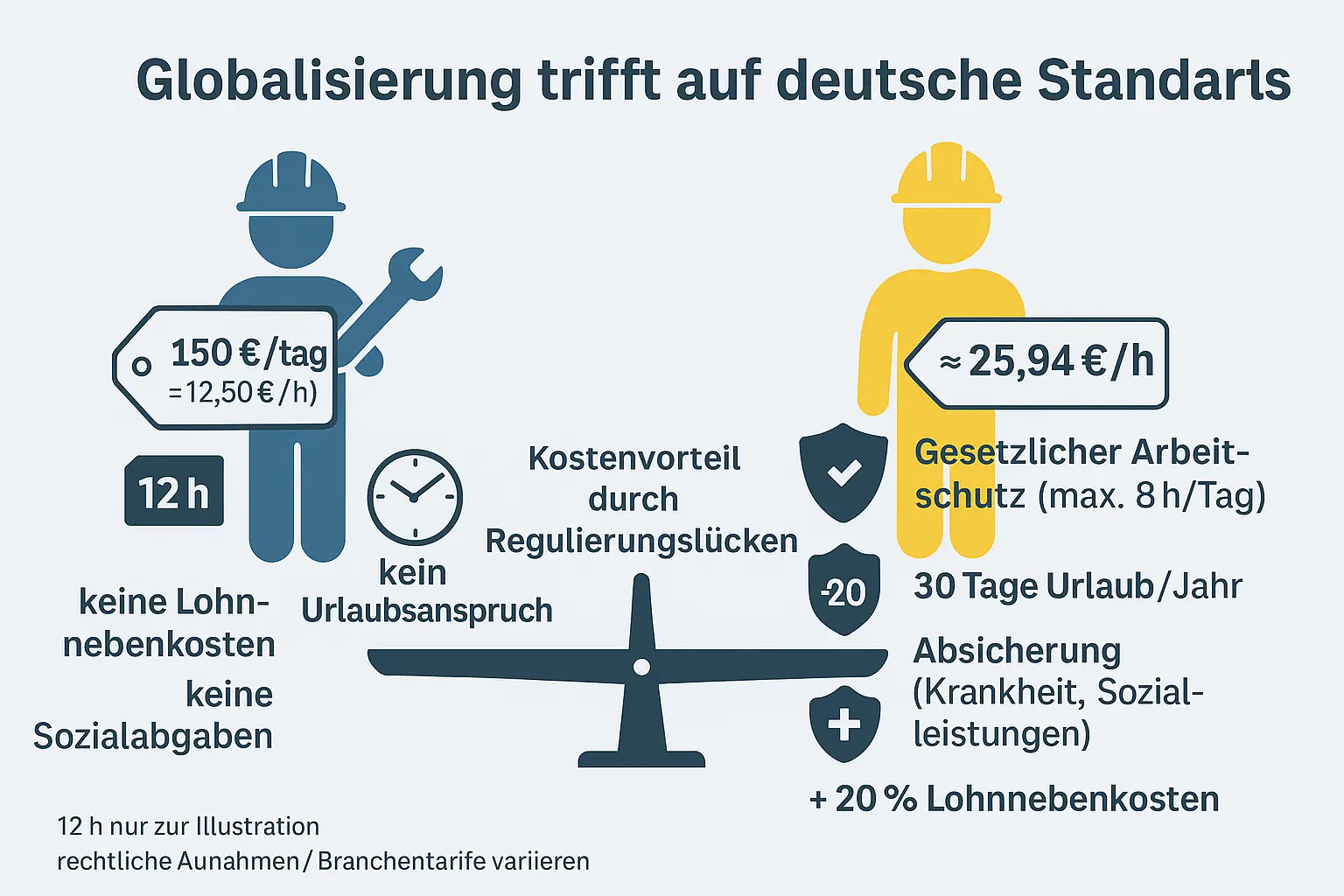 - Ein selbstständiger Monteur aus dem Ausland kann hingegen für 150 € pro Tag (effektiv 12,50 €/h bei 12-Stunden-Tagen) arbeiten – ohne Mindestlohn, ohne Urlaubsanspruch, ohne Absicherung.